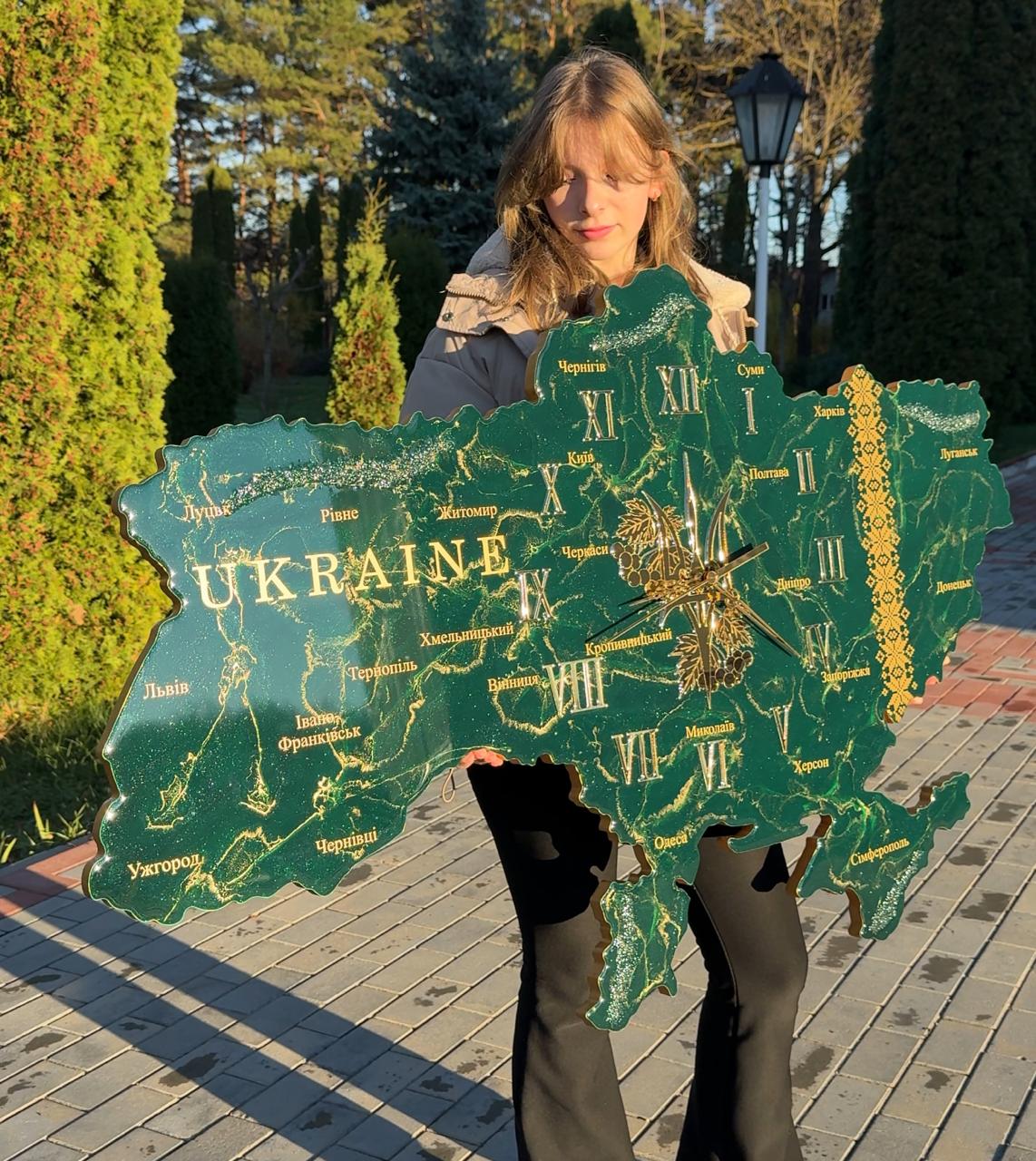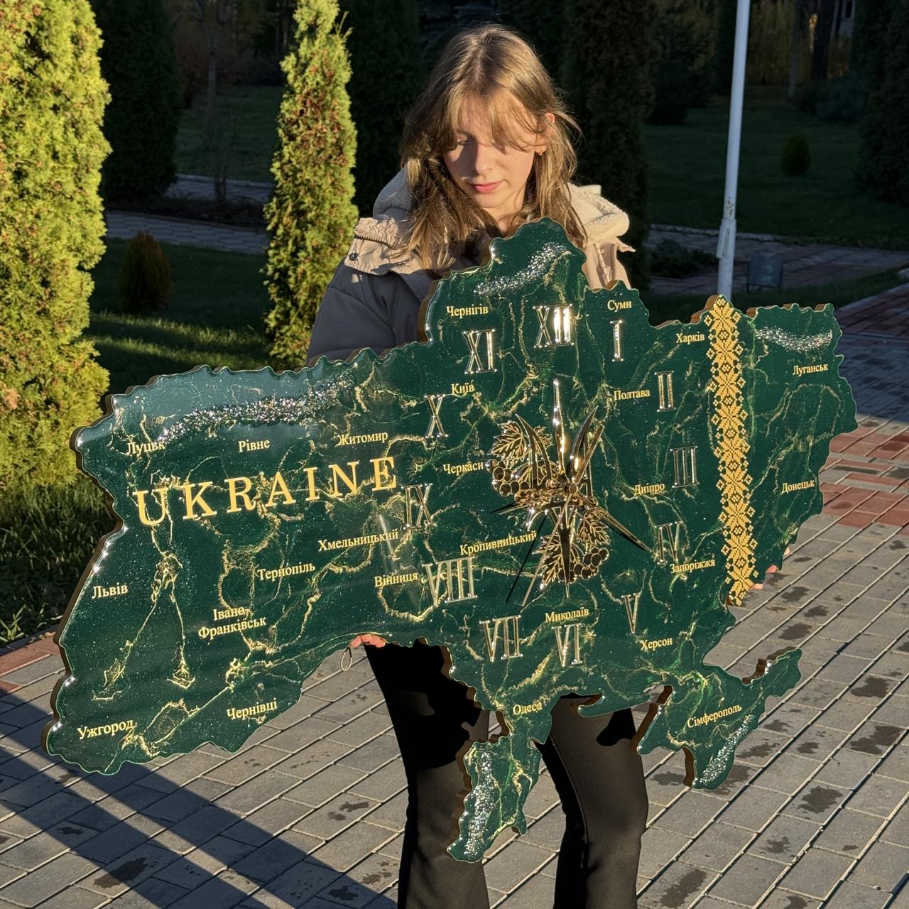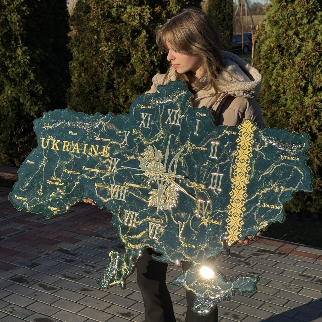 Годинник у формі України в насиченому смарагдовому кольорі з золотими написами та етнічним орнаментом — стильний, елегантний і виразний акцент для будь-якого інтер’єру. Преміальний блиск смоли та деталізація створюють ефект дорогого арт-об’єкта.
