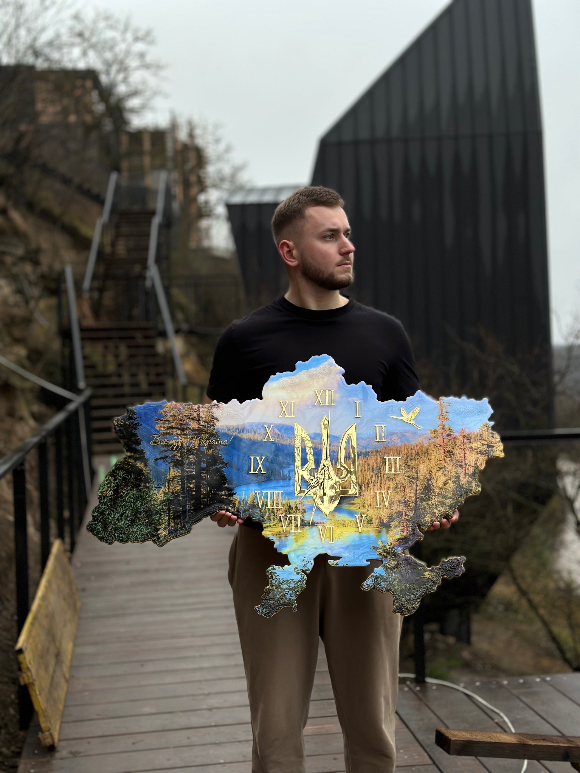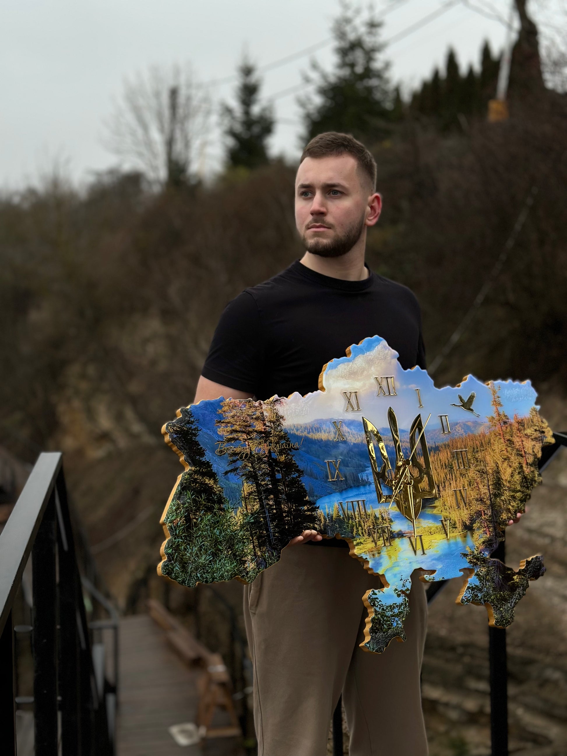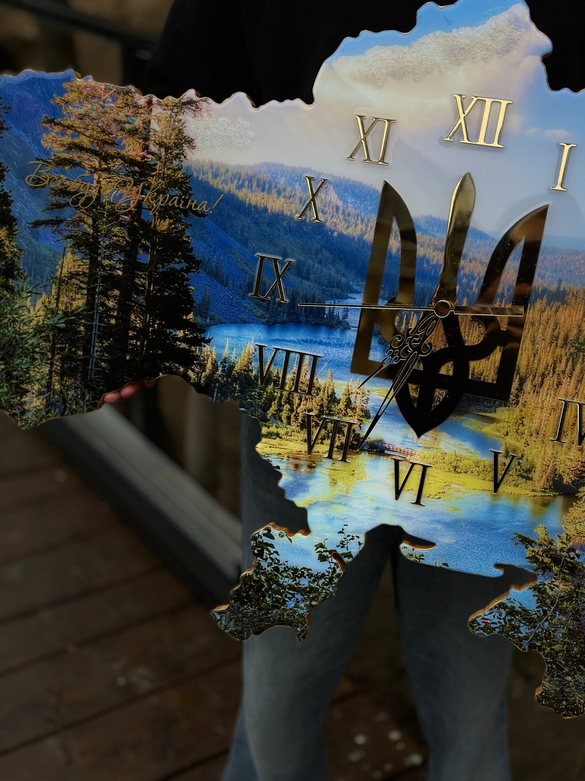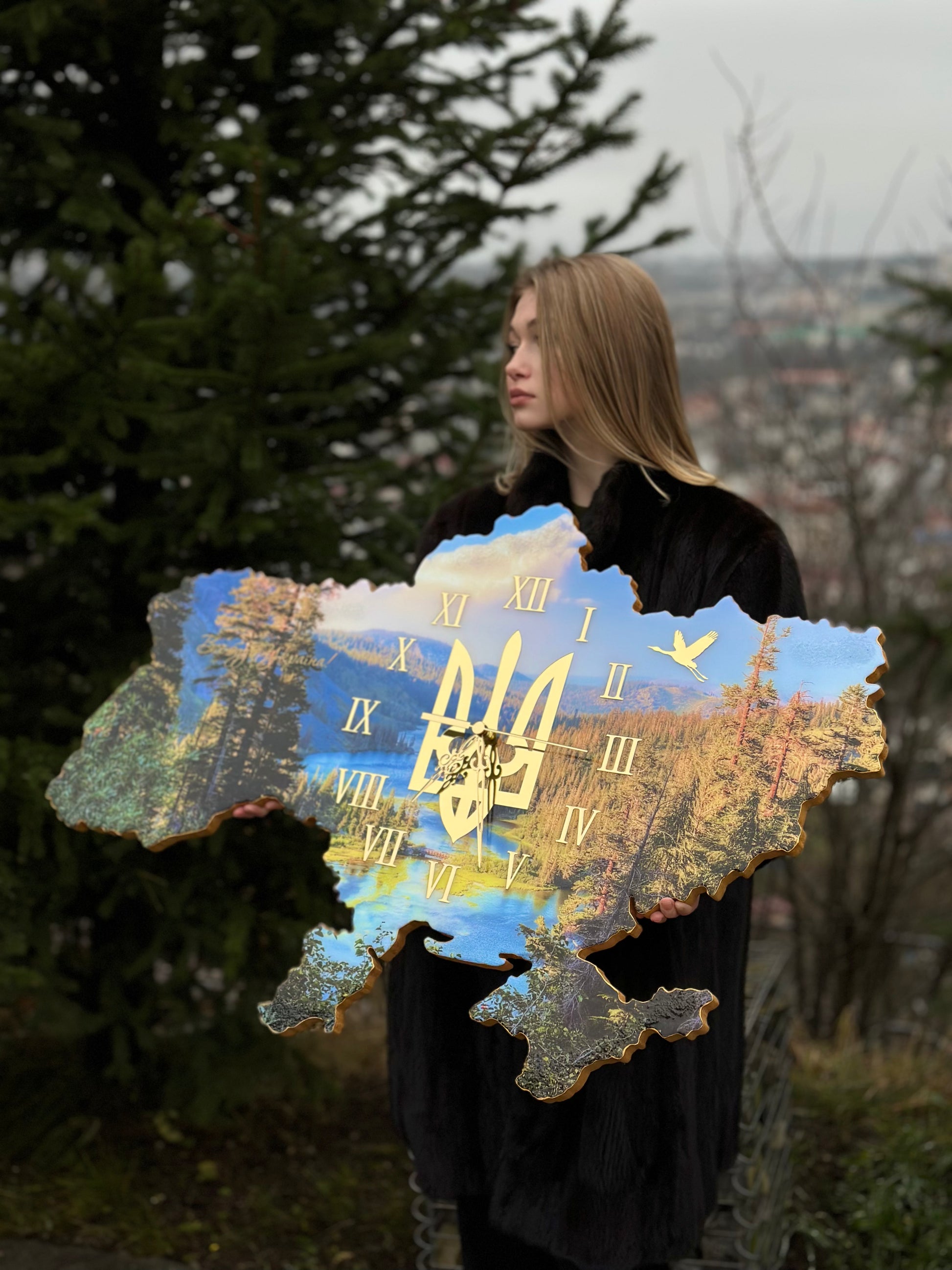 Цей вражаючий годинник у формі карти України, прикрашений мальовничими пейзажами наших гір та лісів, стане справжнім акцентом у вашому інтер'єрі. Кожен елемент цього годинника розкриває велич нашої землі, від її зелених долин до небесних висот. Символ тризуба додає патріотичний акцент, підкреслюючи нашу національну гордість.