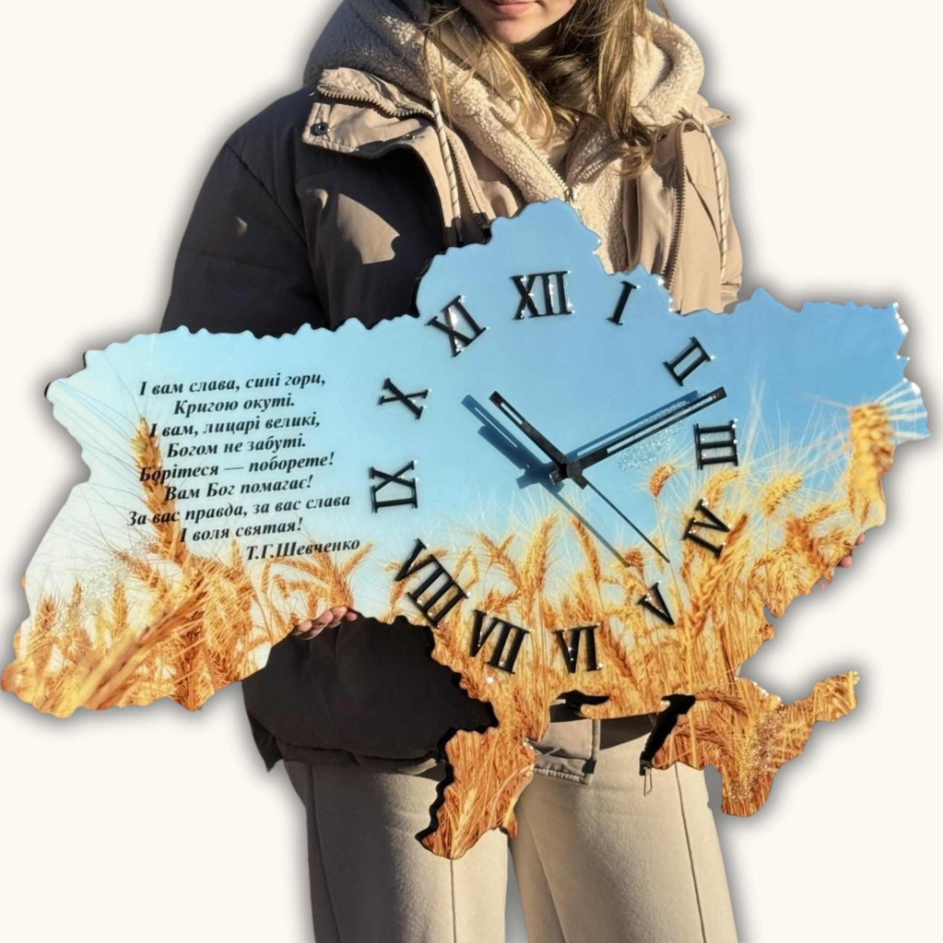 Годинник у формі України з ніжним небесно-золотим дизайном і пшеничним полем — символ миру, родючості та нашої землі. Легкий, світлий і натхненний, він стане теплою окрасою будь-якого дому.